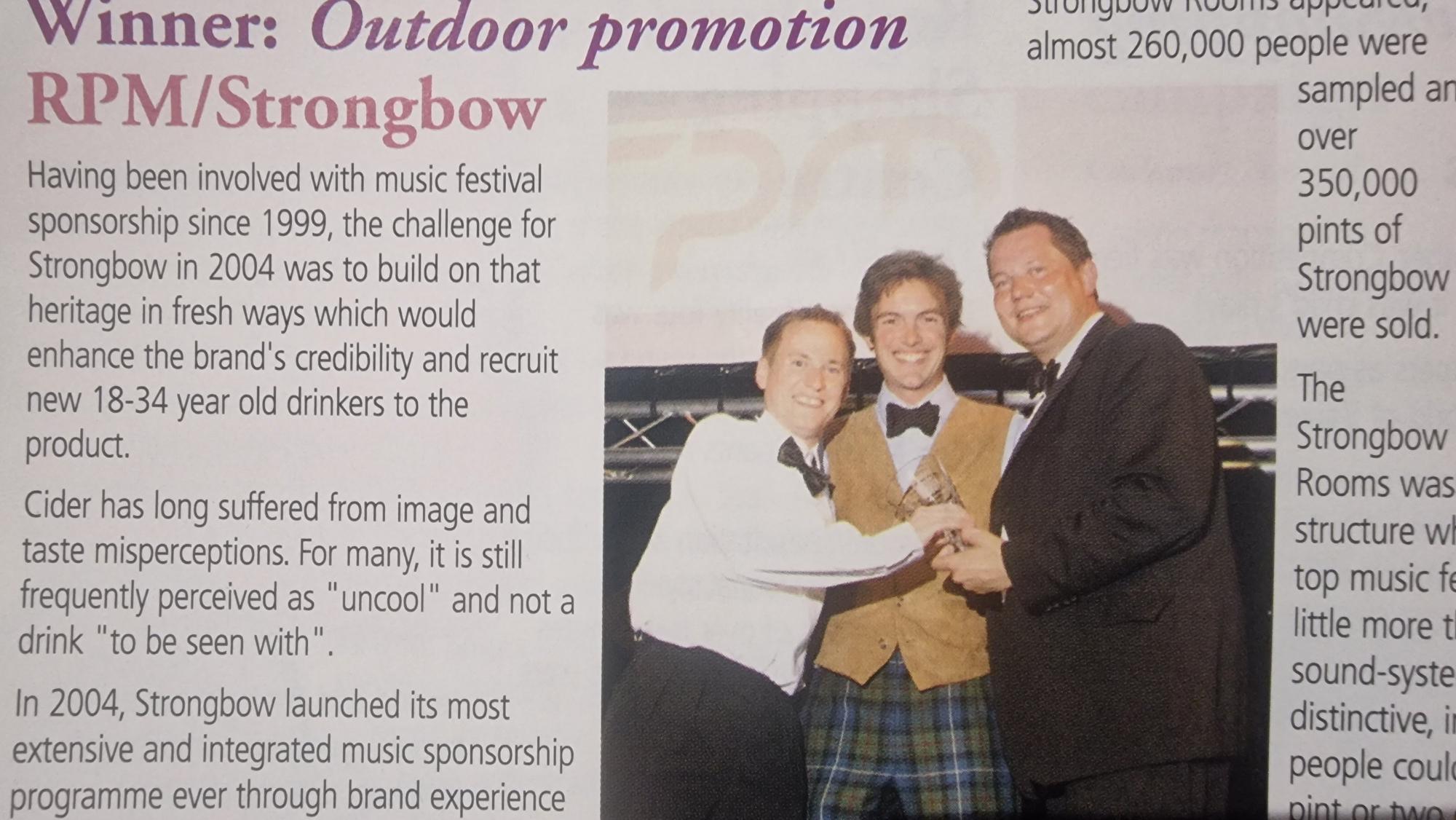 RPM winning in 2004 with current MD Dom Robertson centre. The presenter – right – was Food and Drink authority Joe Wadsack. I shared this with the text from the magazine because it show that even back in 2004 RPM’s reputation was for long term brand strategy – and from the word go FMBE looked for this quality. RPM’s core relations include Diageo and Sky and both have shorlisted through the years since. We even named Sky for special Experiential Brand recognition about 10 years ago when the brand – supported by RPM with Skyride – had taken centre stage of the cycling revolution in Britain.
