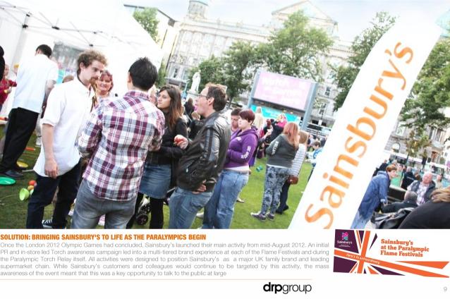 2013 – Still the strongest ever entry in our sponsorship activation category – DRPG and Sainsbury’s actvation of the supermarket’s Paralympic Games sponsorship that saw Sainsbury’s carers recognised as torch bearers, a huge B2E success, store sales success and an inclusive Active Kids legacy.